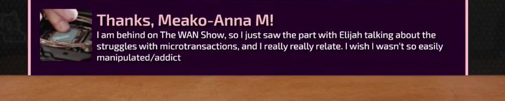 I am behind on The WAN Show, so I just saw the part with Elijah talking about the struggles with microtransactions, and I really really relate. I wish I wasn't so easily manipulated/addict