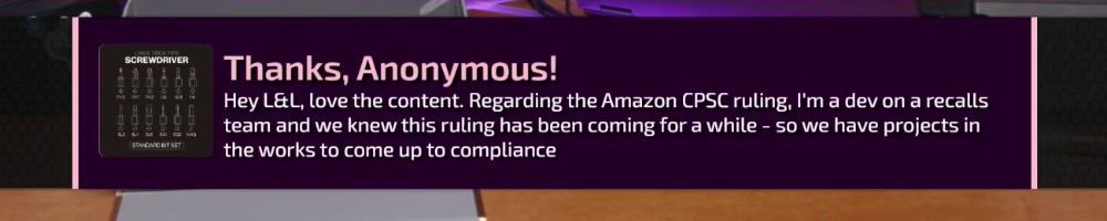 Hey L&L, love the content. Regarding the Amazon CPSC ruling, I'm a dev on a recalls team and we knew this ruling has been coming for a while - so we have projects in the works to come up to compliance