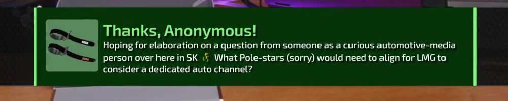 Hoping for elaboration on a question from someone as a curious automotive-media person over here in SK 🤘 What Pole-stars (sorry) would need to align for LMG to consider a dedicated auto channel?