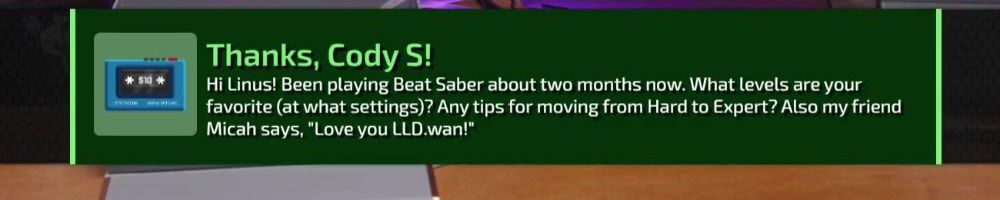 Hi Linus! Been playing Beat Saber about two months now. What levels are your favorite (at what settings)? Any tips for moving from Hard to Expert? Also my friend Micah says, "Love you LLD.wan!"