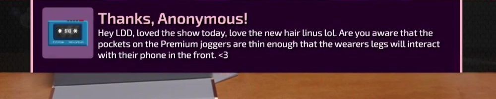 Hey LDD, loved the show today, love the new hair linus lol. Are you aware that the pockets on the Premium joggers are thin enough that the wearers legs will interact with their phone in the front. <3