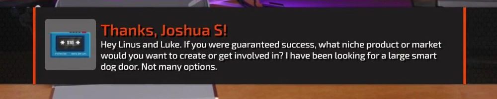 Hey Linus and Luke. If you were guaranteed success, what niche product or market would you want to create or get involved in? I have been looking for a large smart dog door. Not many options.