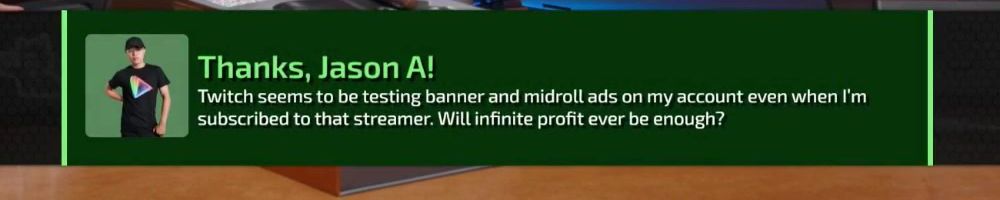 Twitch seems to be testing banner and midroll ads on my account even when I'm subscribed to that streamer. Will infinite profit ever be enough?