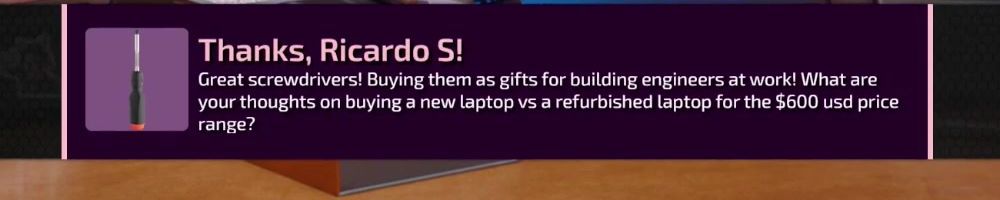 Great screwdrivers! Buying them as gifts for building engineers at work! What are your thoughts on buying a new laptop vs a refurbished laptop for the $600 usd price range?