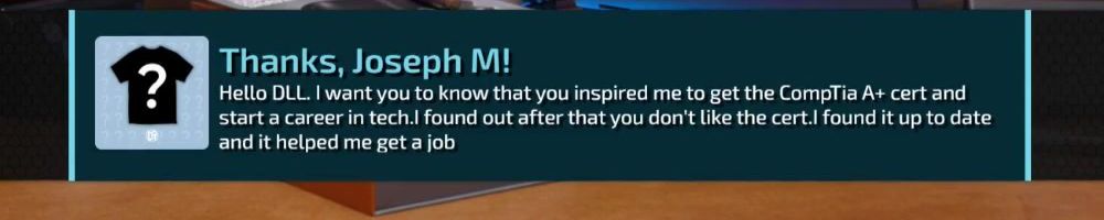Hello DLL. I want you to know that you inspired me to get the CompTia A+ cert and start a career in tech. I found out after that you don't like the cert. I found it up to date and it helped me get a job