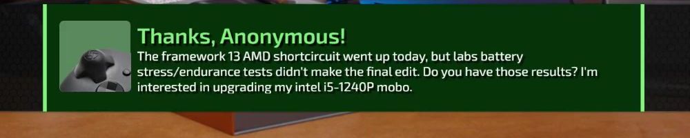 The framework 13 AMD shortcircuit went up today, but labs battery stress/endurance tests didn't make the final edit. Do you have those results? I'm interested in upgrading my intel i5-1240P mobo.