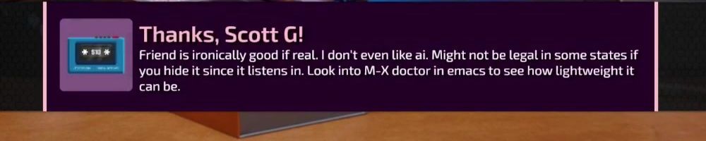 Friend is ironically good if real. I don't even like ai. Might not be legal in some states if you hide it since it listens in. Look into M-X doctor in emacs to see how lightweight it can be.