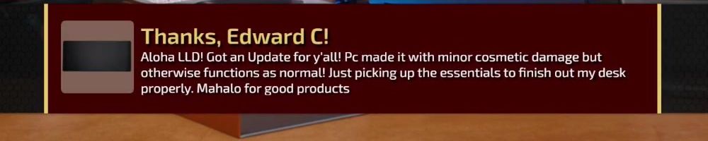Aloha LLD! Got an Update for y'all! Pc made it with minor cosmetic damage but otherwise functions as normal! Just picking up the essentials to finish out my desk properly. Mahalo for good products