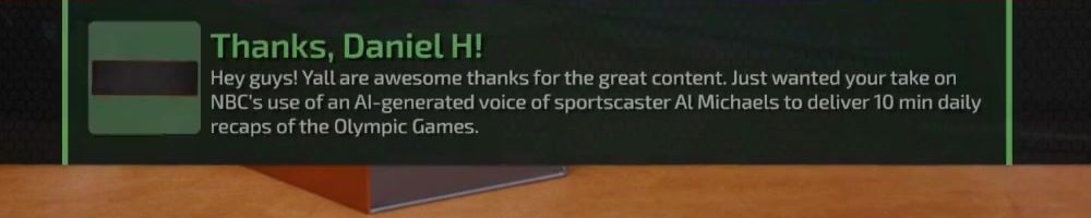 Hey guys! Yall are awesome thanks for the great content. Just wanted your take on NBC's use of an AI-generated voice of sportscaster Al Michaels to deliver 10 min daily recaps of the Olympic Games.