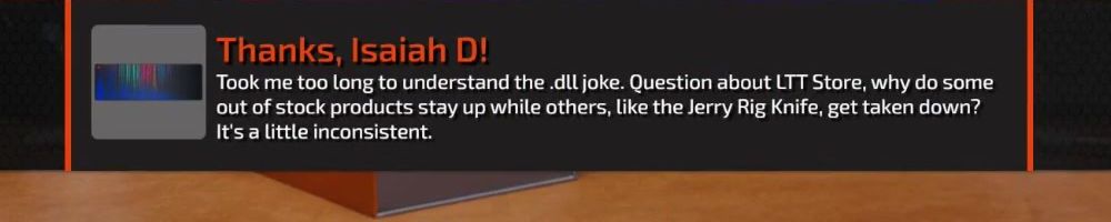 Took me too long to understand the .dll joke. Question about LTT Store, why do some out of stock products stay up while others, like the Jerry Rig Knife, get taken down? It's a little inconsistent.
