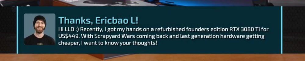 Hi LLD :) Recently, I got my hands on a refurbished founders edition RTX 3080 Ti for US$449. With Scrapyard Wars coming back and last generation hardware getting cheaper, I want to know your thoughts!