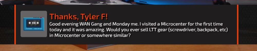 Good evening WAN Gang and Monday me. I visited a Microcenter for the first time today and it was amazing. Would you ever sell LTT gear (screwdriver, backpack, etc) in Microcenter or somewhere similar?