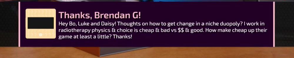 Hey Bo, Luke and Daisy! Thoughts on how to get change in a niche duopoly? I work in radiotherapy physics & choice is cheap & bad vs $$ & good. How make cheap up their game at least a little? Thanks!
