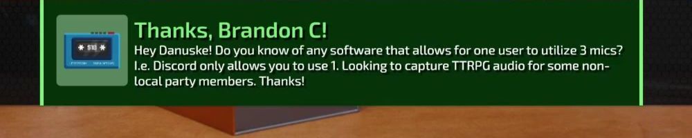 Hey Danuske! Do you know of any software that allows for one user to utilize 3 mics? i.e. Discord only allows you to use 1. Looking to capture TTRPG audio for some non-local party members. Thanks!