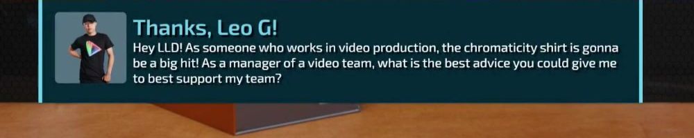 Hey LLD! As someone who works in video production, the chromaticity shirt is gonna be a big hit! As a manager of a video team, what is the best advice you could give me to best support my team?