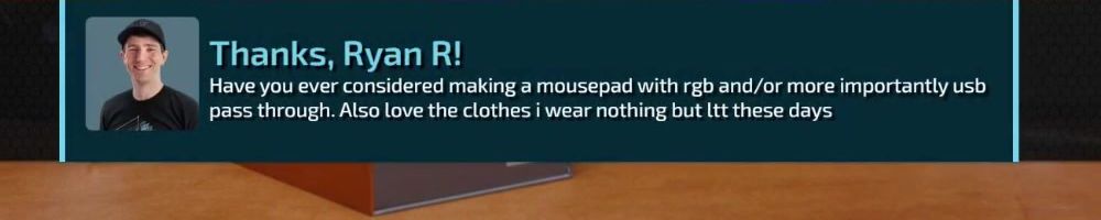 Have you ever considered making a mousepad with rgb and/or more importantly usb pass through. Also love the clothes i wear nothing but Ltt these days