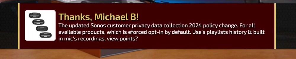 The updated Sonos customer privacy data collection 2024 policy change. For all available products, which is enforced opt-in by default. Use's playlists history & built in mic's recordings, view points?