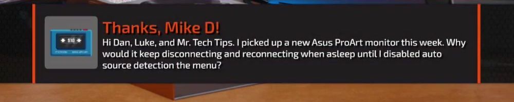Hi Dan, Luke, and Mr. Tech Tips. I picked up a new Asus ProArt monitor this week. Why would it keep disconnecting and reconnecting when asleep until I disabled auto source detection the menu?