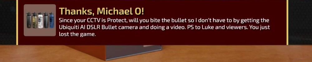 Since your CCTV is Protect, will you bite the bullet so I don't have to by getting the Ubiquiti AI DSLR Bullet camera and doing a video. PS to Luke and viewers. You just lost the game.