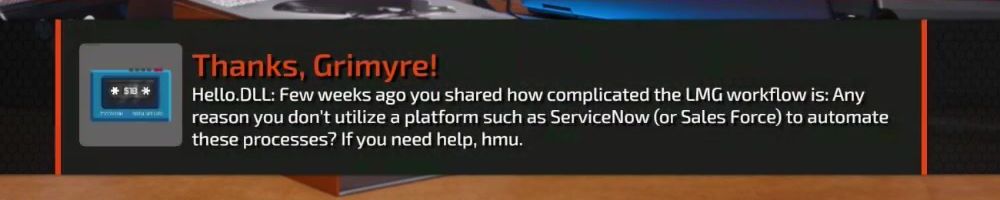 Hello.DLL: Few weeks ago you shared how complicated the LMG workflow is: Any reason you don't utilize a platform such as ServiceNow (or Sales Force) to automate these processes? If you need help, hmu.