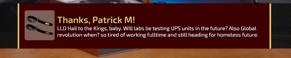 LLD Hail to the Kings, baby. Will labs be testing UPS units in the future? Also Global revolution when? so tired of working fulltime and still heading for homeless future.