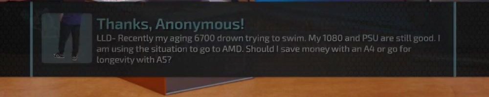 LLD- Recently my aging 6700 drown trying to swim. My 1080 and PSU are still good. I am using the situation to go to AMD. Should I save money with an A4 or go for longevity with A5?