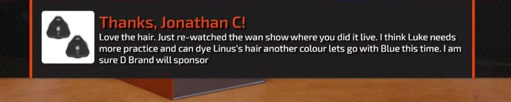 Love the hair. Just re-watched the wan show where you did it live. I think Luke needs more practice and can dye Linus's hair another colour lets go with Blue this time. I am sure D Brand will sponsor