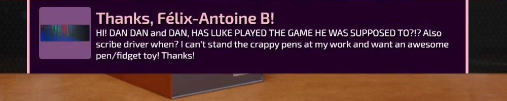 HI! DAN DAN and DAN, HAS LUKE PLAYED THE GAME HE WAS SUPPOSED TO?!? Also scribe driver when? I can't stand the crappy pens at my work and want an awesome pen/fidget toy! Thanks!