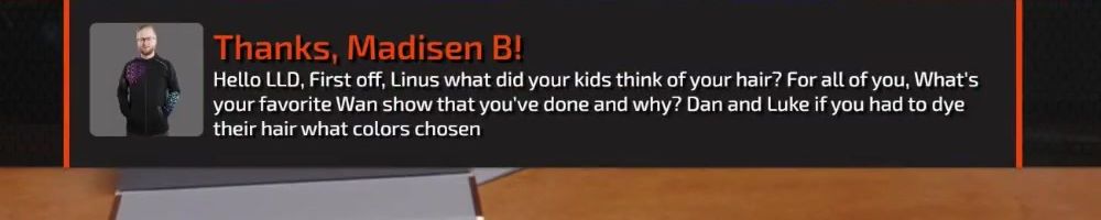 Hello LLD, First off, Linus what did your kids think of your hair? For all of you, What's your favorite Wan show that you've done and why? Dan and Luke if you had to dye their hair what colors chosen