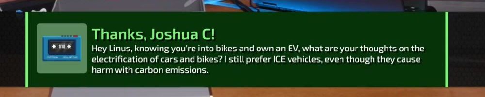 Hey Linus, knowing you're into bikes and own an EV, what are your thoughts on the electrification of cars and bikes? I still prefer ICE vehicles, even though they cause harm with carbon emissions.