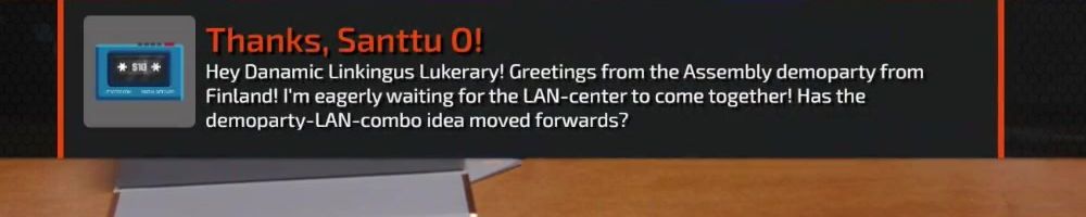 Hey Danamic Linkingus Lukerary! Greetings from the Assembly demoparty from Finland! I'm eagerly waiting for the LAN-center to come together! Has the demoparty-LAN-combo idea moved forwards?