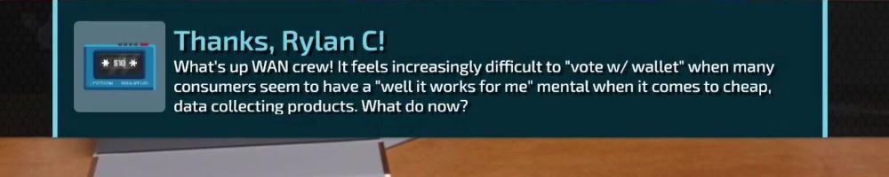 What's up WAN crew! It feels increasingly difficult to "vote w/ wallet" when many consumers seem to have a "well it works for me" mental when it comes to cheap, data collecting products. What do now?