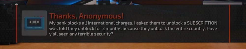 My bank blocks all international charges. I asked them to unblock a SUBSCRIPTION. I was told they unblock for 3 months because they unblock the entire country. Have y'all seen any terrible security?