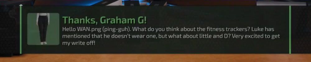 Hello WAN.png (ping-guh). What do you think about the fitness trackers? Luke has mentioned that he doesn't wear one, but what about little and D? Very excited to get my write off!