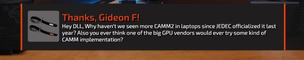 Hey DLL, Why haven't we seen more CAMM2 in laptops since JEDEC officialized it last year? Also you ever think one of the big GPU vendors would ever try some kind of CAMM implementation?