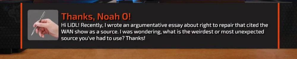 Hi Lidl! Recently, I wrote an argumentative essay about right to repair that cited the WAN show as a source. I was wondering, what is the weirdest or most unexpected source you've had to use? Thanks!