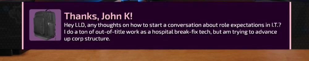 Hey LLD, any thoughts on how to start a conversation about role expectations in I.T.? I do a ton of out-of-title work as a hospital break-fix tech, but am trying to advance up corp structure.