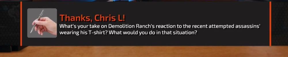 What's your take on Demolition Ranch's reaction to the recent attempted assassins' wearing his T-shirt? What would you do in that situation?