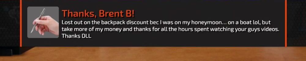 Lost out on the backpack discount bec I was on my honeymoon... on a boat lol, but take more of my money and thanks for all the hours spent watching your guys videos. Thanks DLL