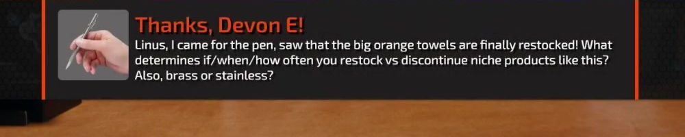 Linus, I came for the pen, saw that the big orange towels are finally restocked! What determines if/when/how often you restock vs discontinue niche products like this? Also, brass or stainless?