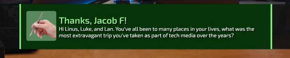 Hi Linus, Luke, and Lan. You've all been to many places in your lives, what was the most extravagant trip you've taken as part of tech media over the years?