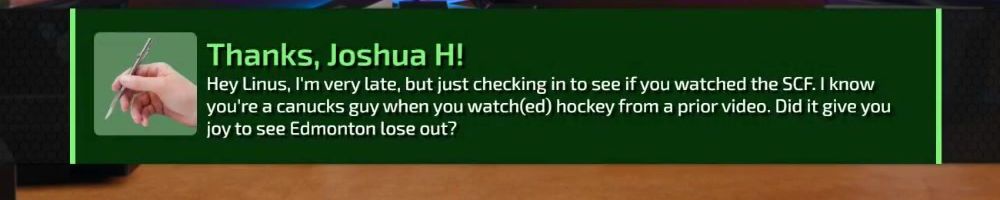 Hey Linus, I'm very late, but just checking in to see if you watched the SCF. I know