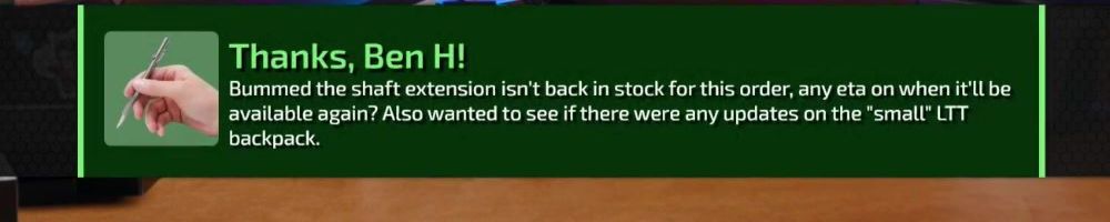 Bummed the shaft extension isn't back in stock for this order, any eta on when it'll be available again? Also wanted to see if there were any updates on the "small" LTT backpack.