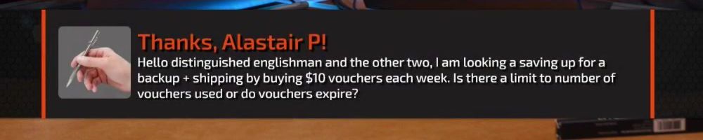 Hello distinguished englishman and the other two, I am looking a saving up for a backup + shipping by buying $10 vouchers each week. Is there a limit to number of vouchers used or do vouchers expire?