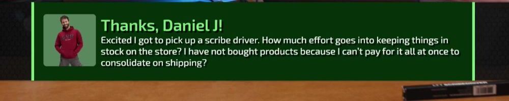 Excited I got to pick up a scribe driver. How much effort goes into keeping things in stock on the store? I have not bought products because I can't pay for it all at once to consolidate on shipping?