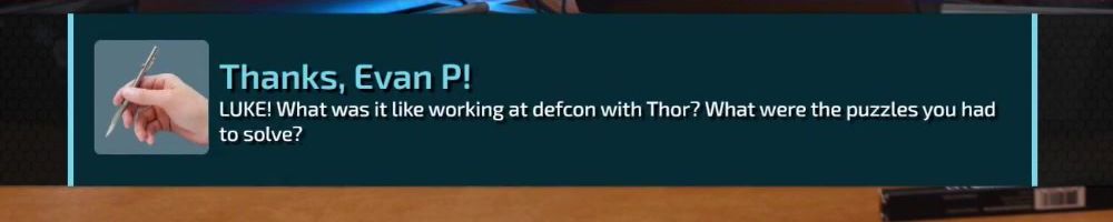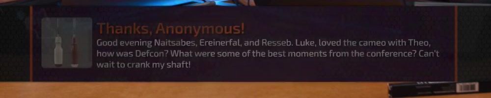 Good evening Naitsabes, Ereinerfal, and Resseb. Luke, loved the cameo with Theo, how was Defcon? What were some of the best moments from the conference? Can't wait to crank my shaft!