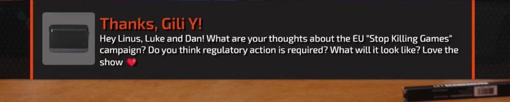 Hey Linus, Luke and Dan! What are your thoughts about the EU "Stop Killing Games" campaign? Do you think regulatory action is required? What will it look like? Love the show 💕