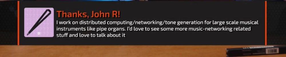 I work on distributed computing/networking/tone generation for large scale musical instruments like pipe organs. I'd love to see some more music-netwarking related stuff and love to talk about it