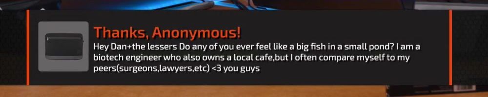 Hey Dan+the lessers Do any of you ever feel like a big fish in a small pond? I am a biotech engineer who also owns a local cafe, but I often compare myself to my peers (surgeons, lawyers, etc) <3 you guys