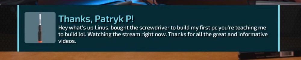 Hey what's up Linus, bought the screwdriver to build my first pc you're teaching me to build lol. Watching the stream right now. Thanks for all the great and informative videos.